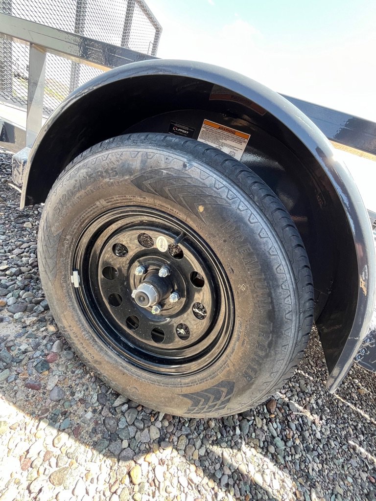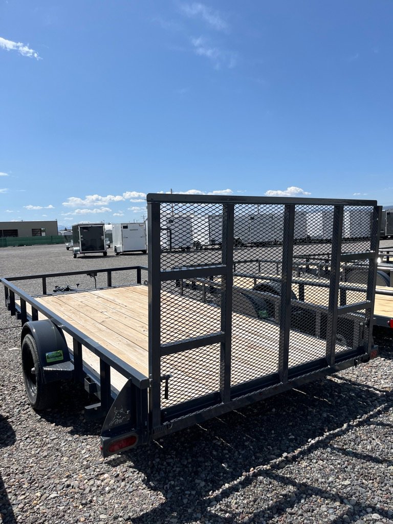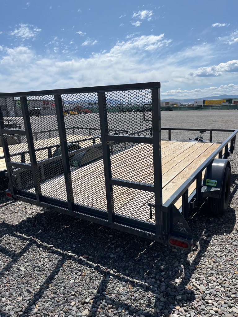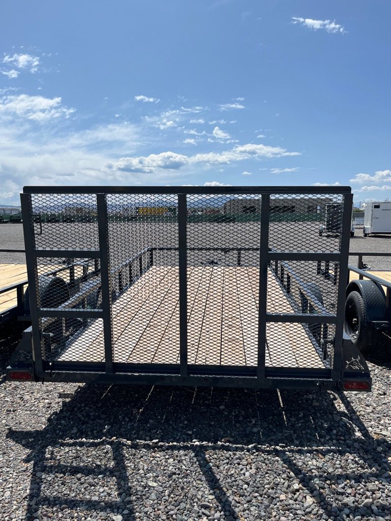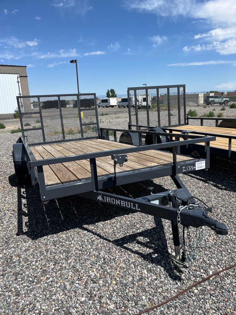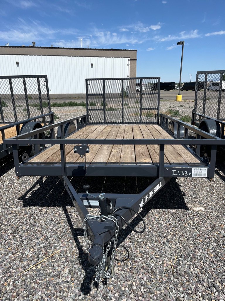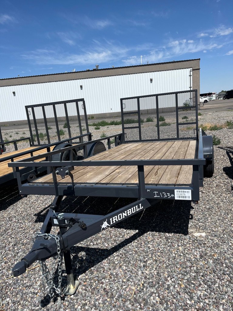 2025 Iron Bull Utility Trailer 83×14 Single Axle, 3500# Axle Rating, 4 in Channel Frame, Straight Deck, Welded Top Tube Rail, 4′ Tail Gate w/ Springs, Top Wind Swivel Jack, Treated Wood Floor, Stake Pockets, Tie Downs, Spare tire Mount, ST2052/75 R15 8 PLY. Empty Wight 1609