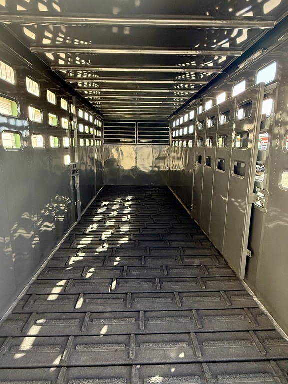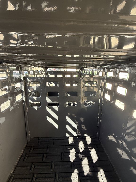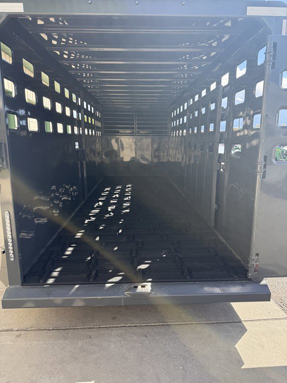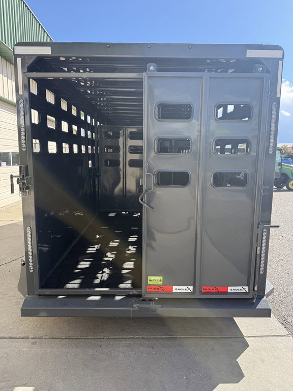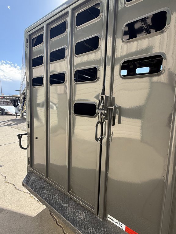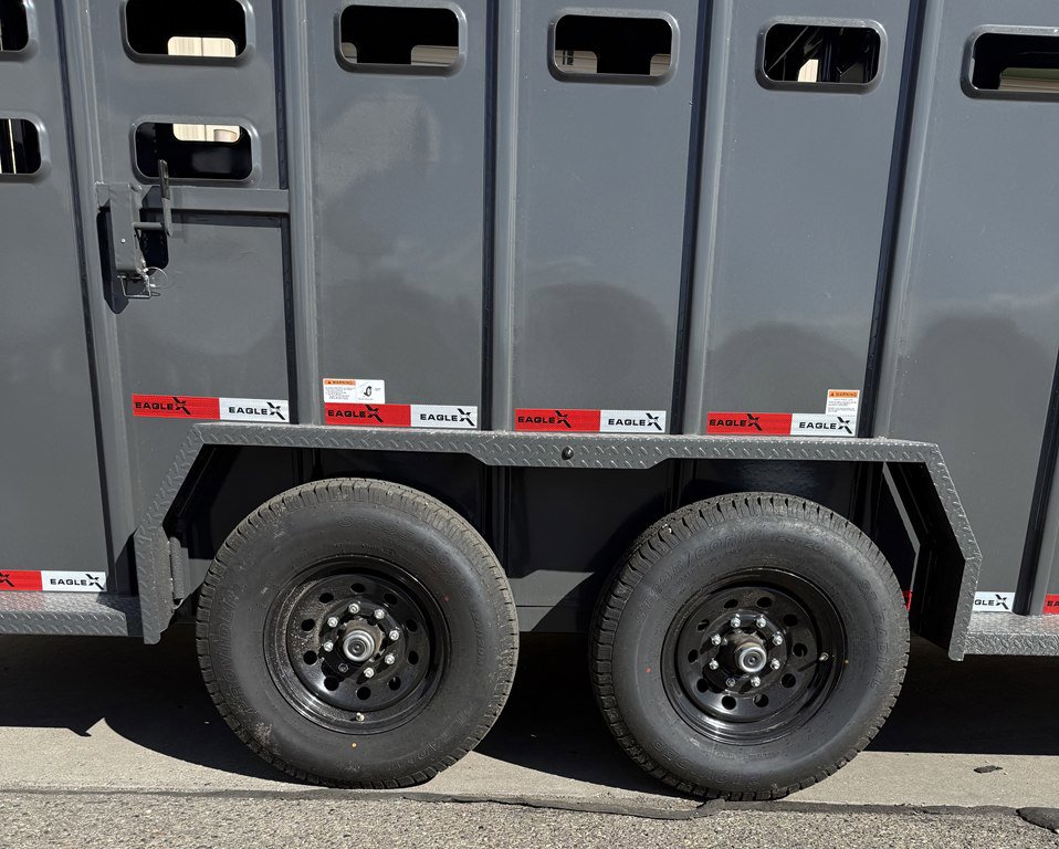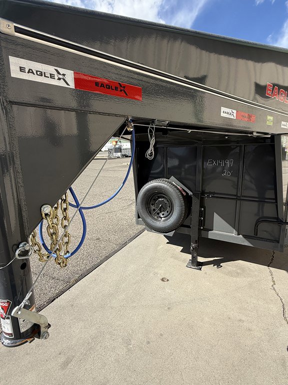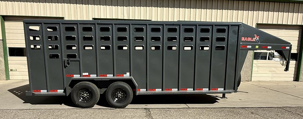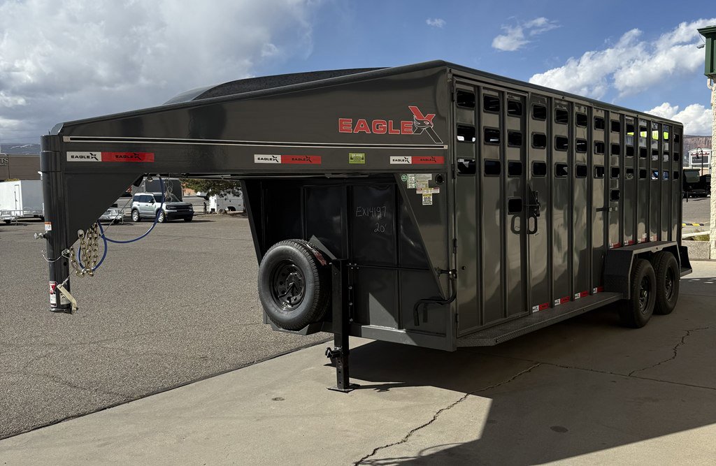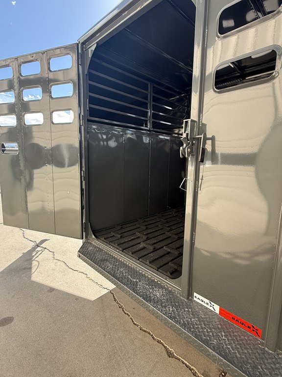 2026 EAGLE X GOOSENECK 20′ STOCK TRAILER Self Cleaning Cleated Floors, Remote coupler Lever Release, Punch Plate Walls, Spring Loaded SLam Latches, EZ lube Hubs, Brakes On Both Axles, diamond Plate Side Step On Both Sides, Half Slide Rear Gate, Divder Gate, 12 Volt Interior Lights, LED Lights, 6’6 Interior Height, Sadle Storage Above Gooseneck, Spare Tire, 14k Rated, Escape Doors