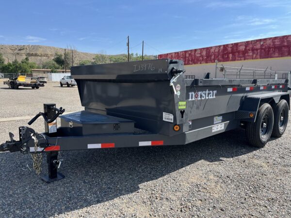 NORSTAR 7’X14′ DUMP TRAILER 14K Rated, Slide Out Ramps, Scissor Style Hoist, Adjustable Coupler, Reflective DOT Marking Tape, Gray Powder Coated, Roll Up Tarp Kit, All LED Lighting, 16” Radial Tires, Electric Brakes On All Wheels, Heavy Duty Diamond Plate Fenders, Heavy Duty Spring Loaded Drop Leg Jack, D-Rings, Spare Tire Carrier, Locking Tongue Box, Iron Clad Warranty.